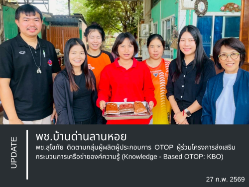 นางทองหล่อ สวัสดิเทพ พัฒนาการจังหวัดสุโขทัย มอบหมายให้ นางสาวจุฑามาศ ผดุงศักดิ์ นักวิชาการพัฒนาชุมชนชำนาญการ ลงพื้นที่ร่วมกับบริษัท มาดามเจ จำกัด ติดตามกลุ่มผู้ผลิตผู้ประกอบการ OTOP ผู้ร่วมโครงการส่งเสริมกระบวนการเครือข่ายองค์ความรู้ (Knowledge - Based OTOP: KBO) ของอำเภอบ้านด่านลานหอย